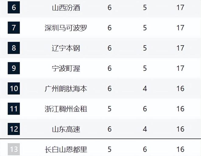 而6-10全部都是6勝,分別是山西、深圳、遼寧、寧波和廣州。其中山西、深圳和遼寧都是兩連勝,之前山西與遼寧遭遇連敗,這兩場比賽算是讓他們緩口氣了,不過后續(xù)能不能繼續(xù)保持好的趨勢還是未知數(shù),因為球隊的弊端沒有改變。寧波這輪即便惜敗北京,他們本賽季必然會成為攪局者。廣州則少打一場比賽,這輪拿下新疆之后,已經三連勝了。
