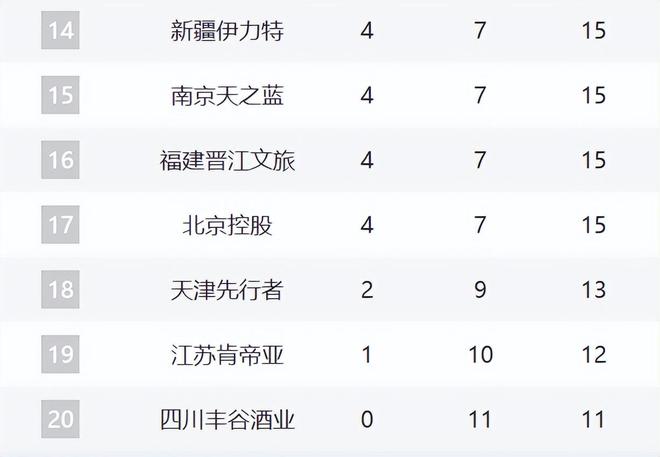 天津、江蘇和四川都是難兄難弟。當然天津這輪擊敗北控,難得拿下一場勝利,但他們基本上就是鎖定倒數(shù)了。