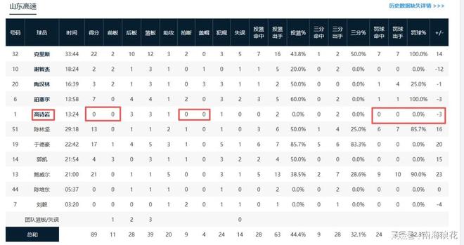 同樣是后衛(wèi),與于德豪相比,拿著頂薪600萬的高詩巖就差多了,他繼續(xù)著他打鐵的風(fēng)采和特點,全場毫無手感,2投0中,一分不得。交出慘淡的數(shù)據(jù):0分0搶斷,甚至0罰球,正負值是負。更令高詩巖尷尬的是,因為于德豪打得好,主教練邱彪棄用了高詩巖,僅讓他打了13分鐘,比于德豪少打了9分鐘。上一場高詩巖輪休,山東隊也戰(zhàn)勝了北京隊。山東隊贏球有一條規(guī)律,那就是高詩巖不上場或是少上場山東隊贏球的概率就大,反之贏球的概率就小。