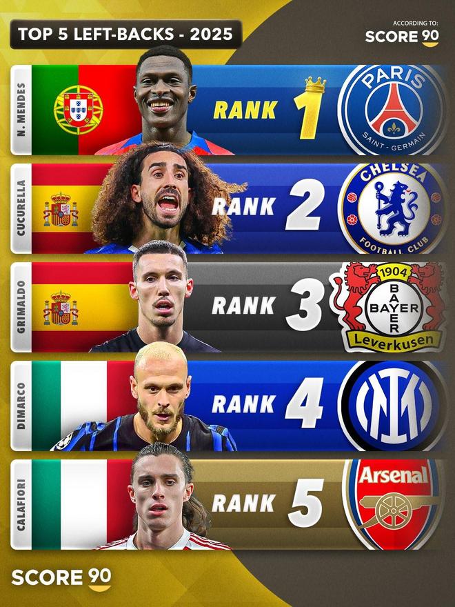 北京時(shí)間12月31日,Score90公布了根據(jù)他們的數(shù)據(jù)統(tǒng)計(jì)選出的2025年五大后衛(wèi),其中在中衛(wèi)位置上加布里埃爾排名第一,而兩個(gè)邊后衛(wèi)則是巴黎的雙邊衛(wèi)阿什拉夫、努諾-門德斯。
