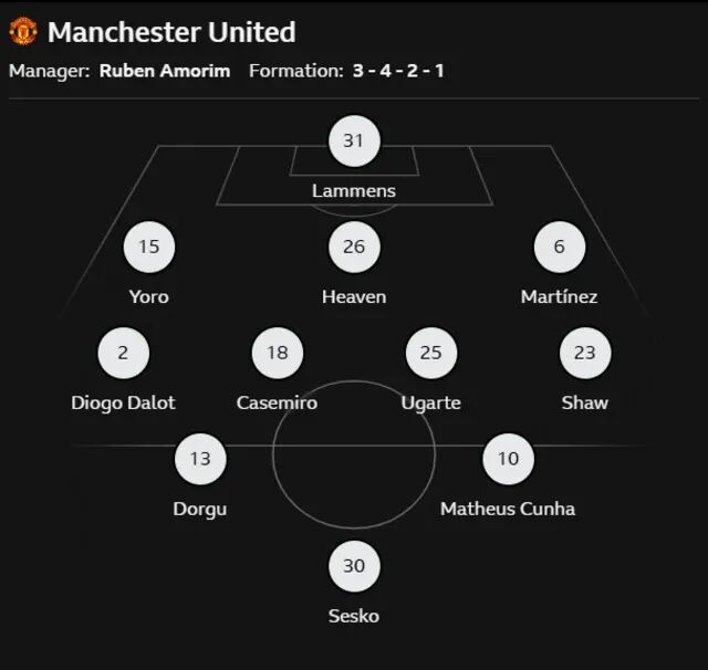 布魯諾·費(fèi)爾南德斯、梅森·芒特、科比·梅諾、德里赫特和馬奎爾繼續(xù)傷缺,姆貝莫、阿馬德·迪亞洛和馬茲拉維還在踢非洲國家杯,魯本·阿莫林恢復(fù)了自己心愛的343陣型,并且選擇了多達(dá)9名傾向于防守的球員,試圖以穩(wěn)為主。