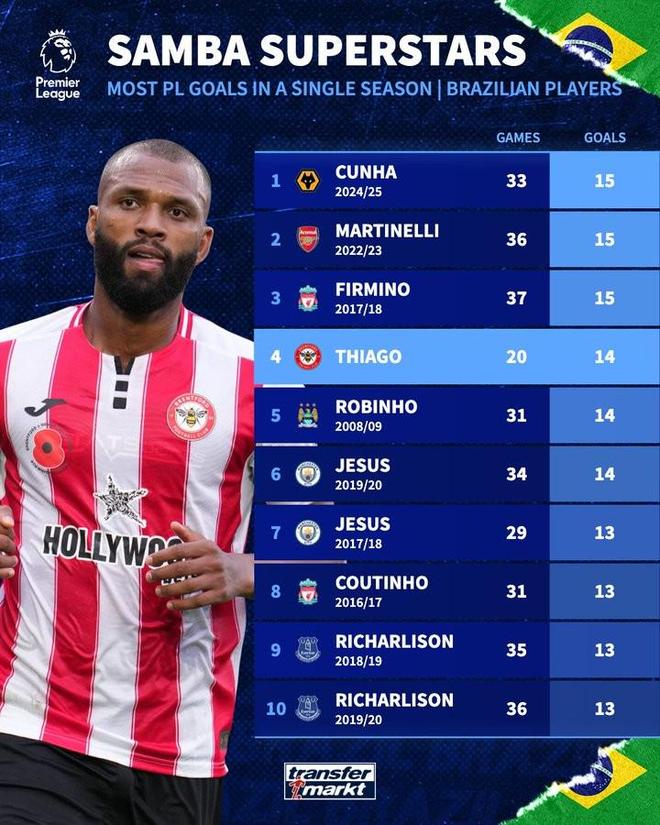目前巴西球員英超單賽季的進球紀(jì)錄是15球,由3人共同保持,它們分別是:庫尼亞(2024/25賽季,狼隊,33場15球);馬丁內(nèi)利(2022/23 賽季,阿森納,36場15球);菲爾米諾(2017/18賽季,利物浦,37場15球)。