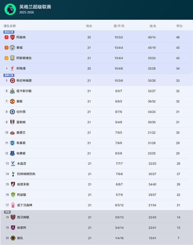 - 英超最新積分戰(zhàn)報(bào) 阿森納開心!切爾西輸球 曼城維拉曼聯(lián)平局丟分