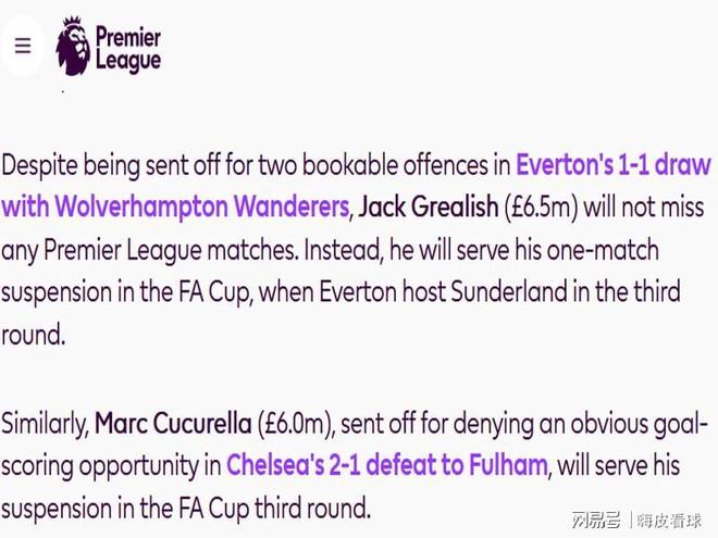 根據(jù)規(guī)則,累積黃牌而停賽,只能在英超賽場接受處罰,而得到紅牌停賽的,可以在其他賽場。英超方面特別指出,雖然曼城借將格拉利什,代表埃弗頓的比賽中領(lǐng)到紅牌,切爾西后衛(wèi)庫庫雷利亞,因為阻止可能的進球而得到紅牌,都不需要在英超停賽,而是在周末進行的足總杯中接受處罰。