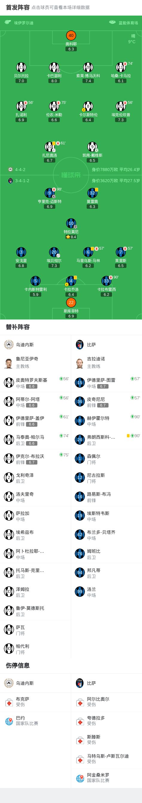 - 烏迪內(nèi)斯2-2比薩,特拉莫尼先拔頭籌,亨里克-邁斯特扳平比分