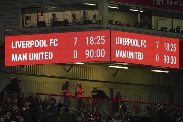 這是2022/23賽季英超第26輪的比賽結(jié)果,當(dāng)時(shí)利物浦主場(chǎng)7-0戰(zhàn)勝曼聯(lián),是曼聯(lián)隊(duì)史在英超遭遇的最慘痛失利之一。