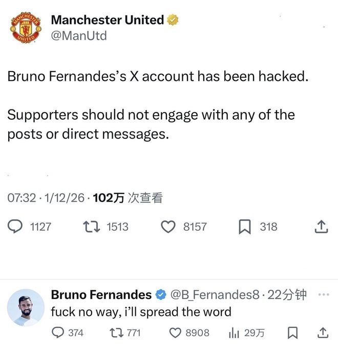 曼聯(lián)社媒隨后發(fā)布公告,表示:“布魯諾-費(fèi)爾南德斯的社媒賬號(hào)遭到入侵。提醒球迷不要點(diǎn)擊、回復(fù)或參與任何相關(guān)帖子及私信?!?/p>