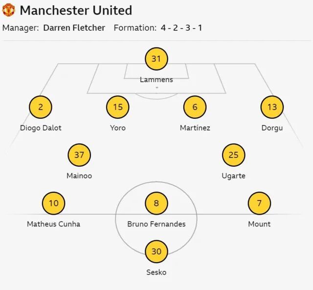 臨時(shí)主帥達(dá)倫·弗萊徹對陣容進(jìn)行一定輪換,埃登·海文、盧克·肖和卡塞米羅輪休,萊尼·約羅、科比·梅諾和梅森·芒特得以首發(fā),帕特里克·多古回到邊后衛(wèi)位置。弗萊徹的一對雙胞胎兒子杰克和泰勒都坐在替補(bǔ)席上。