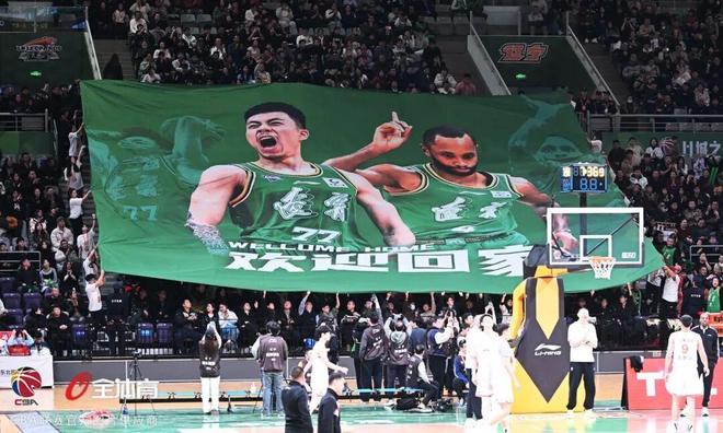 在視頻結(jié)束的瞬間,北區(qū)看臺的中間位置赫然出現(xiàn)了印有效力遼籃時期張鎮(zhèn)麟和弗格形象的巨幅TIFO,全場爆發(fā)出一陣熱烈的掌聲和歡呼聲,歡迎兩位老朋友張鎮(zhèn)麟、弗格回家!