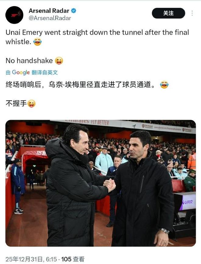 當(dāng)阿爾特塔和助教擊掌相慶后,準(zhǔn)備找到埃梅里握手時,他的西班牙前輩已經(jīng)消失無蹤。