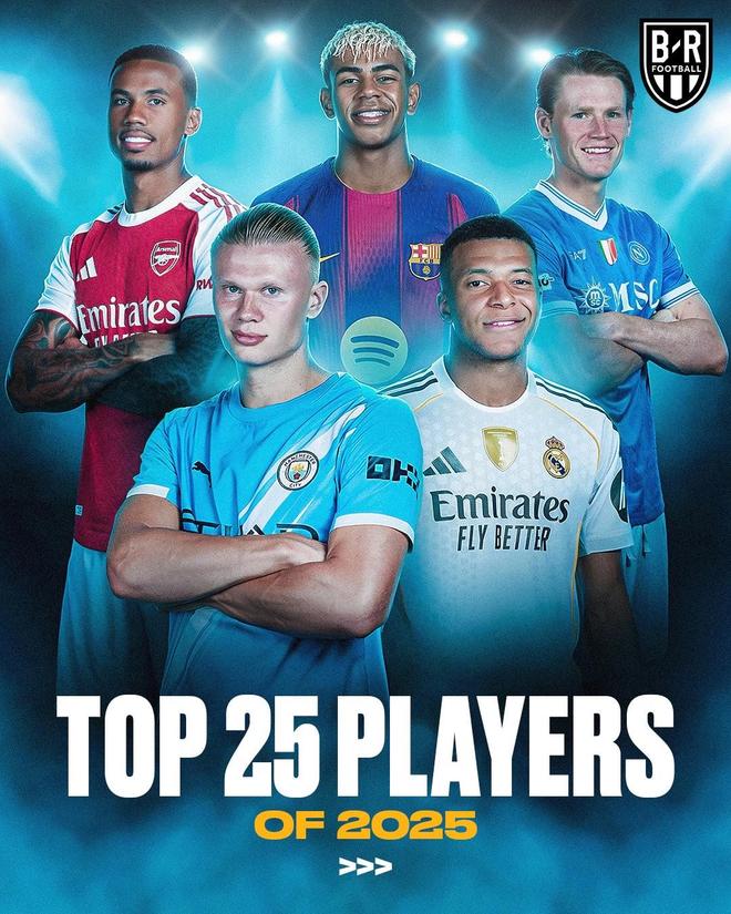 2025年年底,B/R Football評選了2025自然年里的25大球星,登貝萊居首,姆巴佩、凱恩分列2-3位,亞馬爾排名第7。