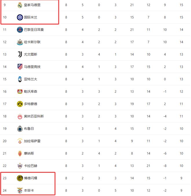 根據(jù)歐冠聯(lián)賽階段排名,積分榜前8名的球隊(duì)已經(jīng)鎖定直通16強(qiáng)的資格,無需參加附加賽。他們分別是:英超阿森納、德甲拜仁慕尼黑、英超利物浦、英超熱刺、西甲巴薩、英超切爾西、葡超葡萄牙體育和英超曼城。