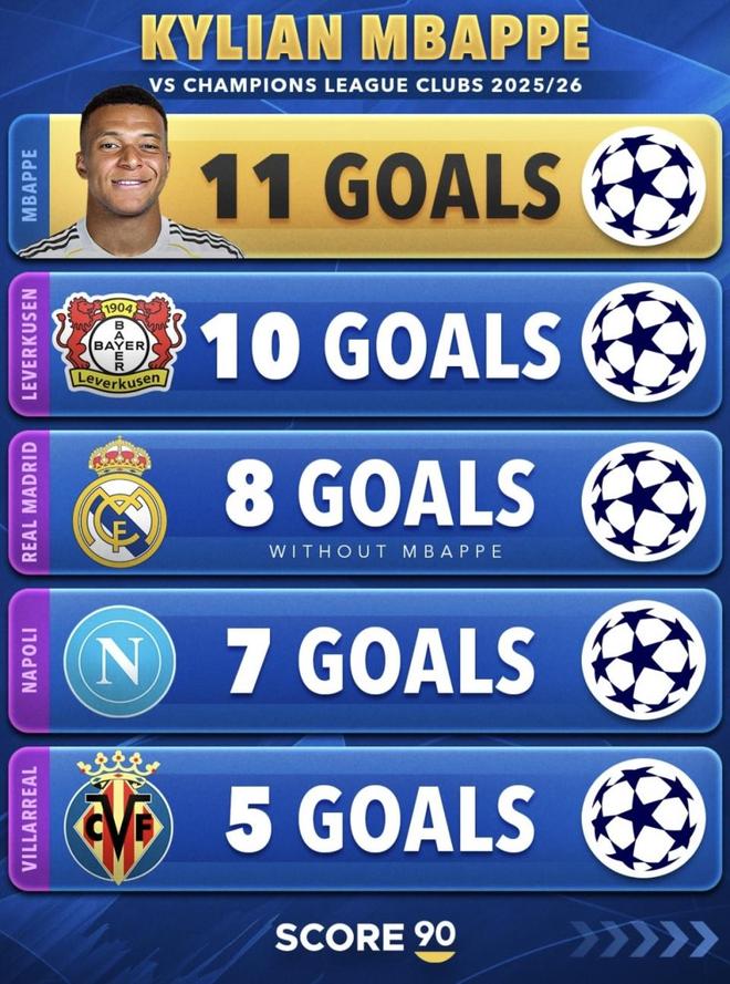 榜單一:姆巴佩對比歐冠球隊(duì)進(jìn)球(2025/26)